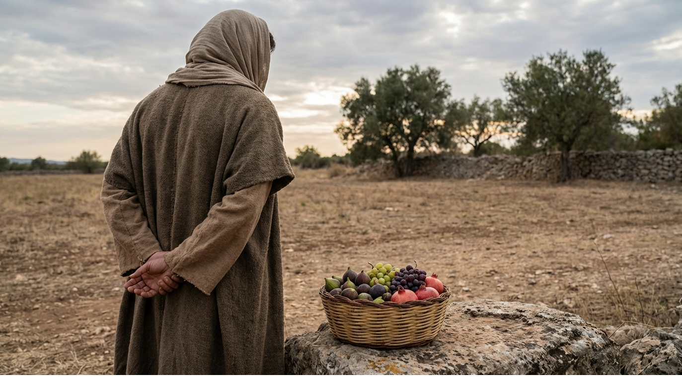Пророк Амос получает одно из своих видений — Г-сподь показывает ему корзину спелых плодов. Г-сподь задает Амосу вопрос: "Что ты видишь, Амос?" Пророк отвечает: "Я вижу корзину летних плодов." На что Всевышний отвечает: "Пришёл конец Моему народу, Израилю, Я больше не пройду мимо него."