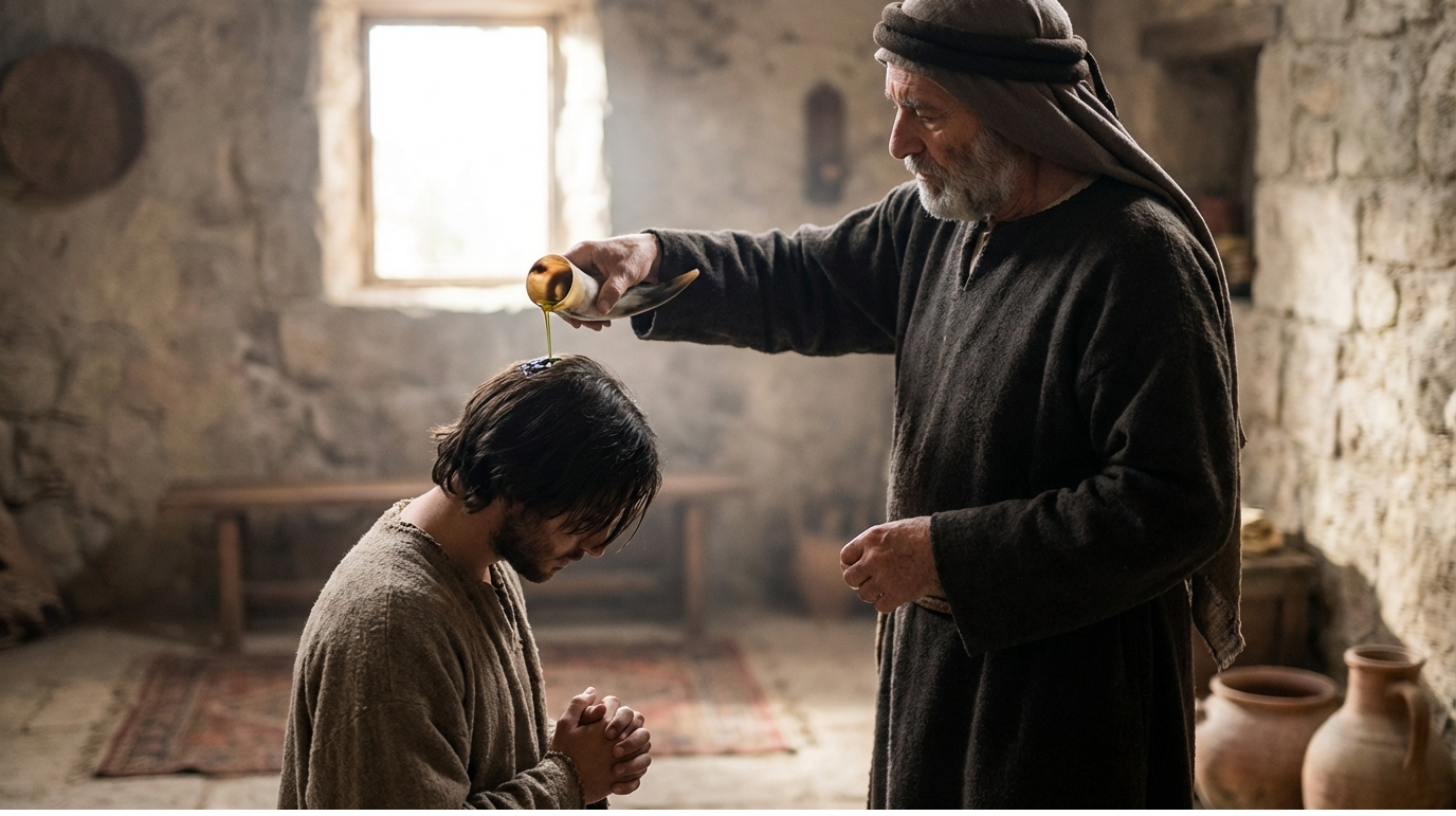 Шмуэль достал рог с маслом и, при всех братьях, помазал Давида. В этот момент дух Б-га сошёл на Давида и остался с ним на всю его жизнь. Хотя Давид ещё не стал царём, это событие стало началом его пути к трону.