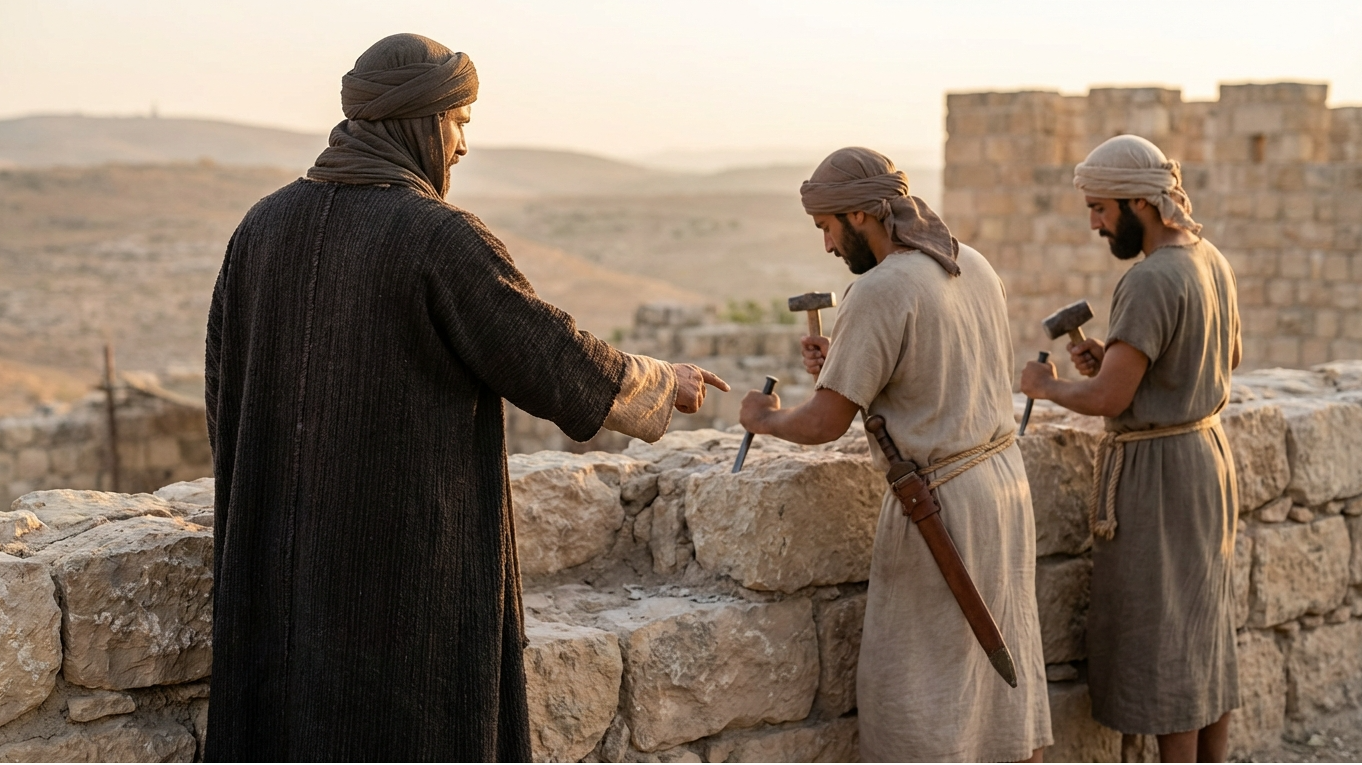 Услышав о разорении и бедственном положении Иерусалима, Нехемья глубоко опечалился и обратился к царю с просьбой разрешить ему восстановить город. Получив разрешение и официальное назначение наместником Иудеи, он прибыл в Иерусалим и немедленно приступил к делу. Под его руководством стены Иерусалима были возведены всего за 52 дня, несмотря на угрозы и нападения врагов. Его подчинённые трудились с мечом в одной руке и инструментом в другой — символ сочетания веры и действия.