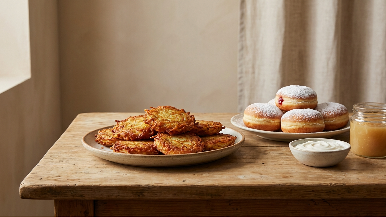 На Хануку принято есть блюда, жареные в масле, чтобы вспомнить чудо масла, горевшего в Храме. Самыми популярными блюдами являются пончики (суфганийот) и драники (латкес) — картофельные оладьи, жаренные в масле. Эти блюда напоминают о важности света, который горел, несмотря на все неблагоприятные обстоятельства.