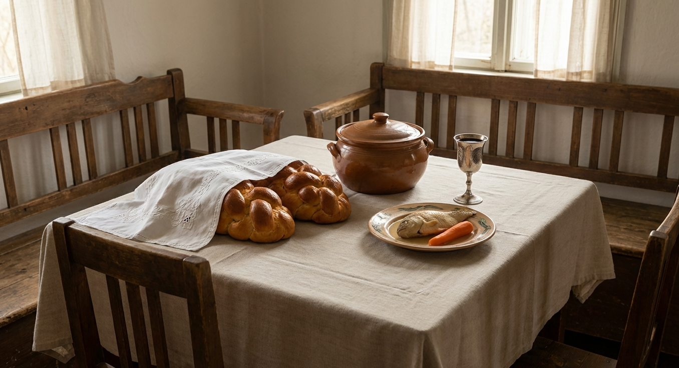 Вот базовый список вещей, которые обязательно должны присутствовать на каждом субботнем столе (хотя всегда можно разнообразить его всевозможными салатами,гарнирами, десертами, сладкими напитками идр., в зависимости от традиций семьи и общины):