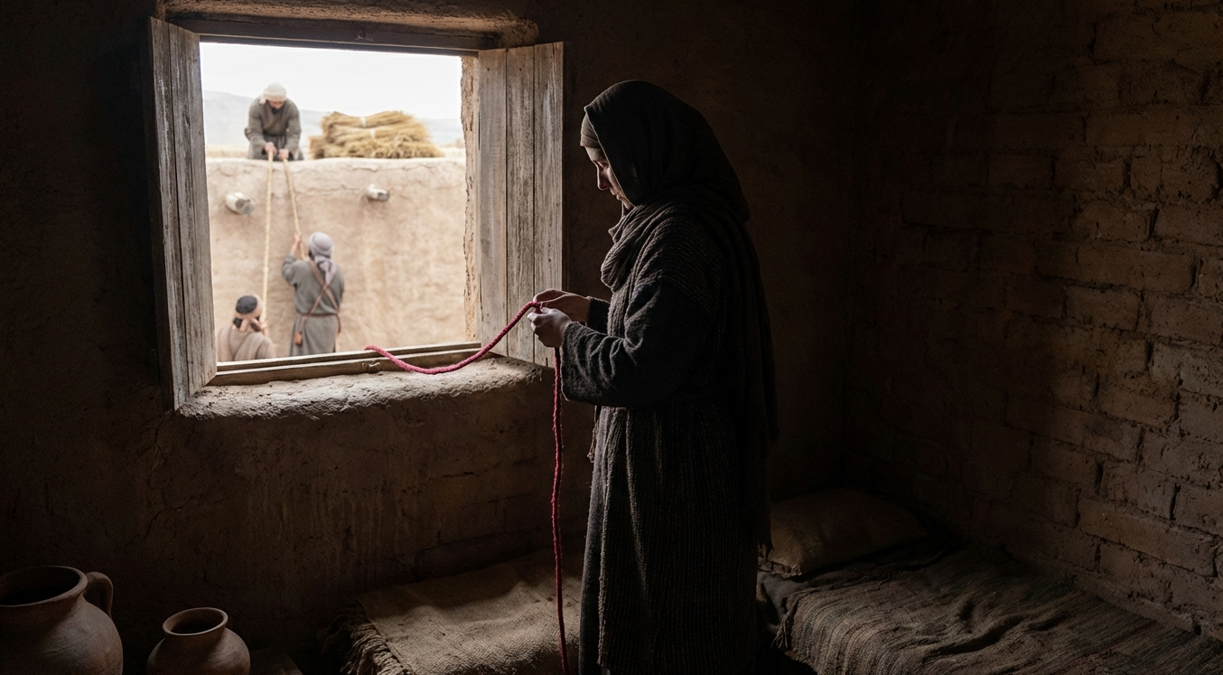 Узнав, что стража царя Иерихона ищет этих людей, Рахав спрятала их на крыше под снопами льна и сказала посланным, что они уже ушли. После этого она помогла разведчикам спуститься через окно и попросила пощадить её и её семью, когда город будет разрушен. Разведчики согласились и велели ей привязать к окну красную верёвку — знак, по которому её дом будет сохранён.