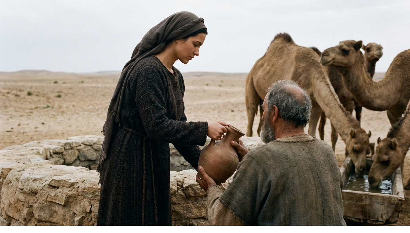Впервые упоминается в Торе как девушка, встретившая слугу Авраама, Элиэзера, у колодца в Харане. Она проявила необычайное гостеприимство, не только напоив его, но и предложив воду для всех его верблюдов (Берешит, 24:17–20).