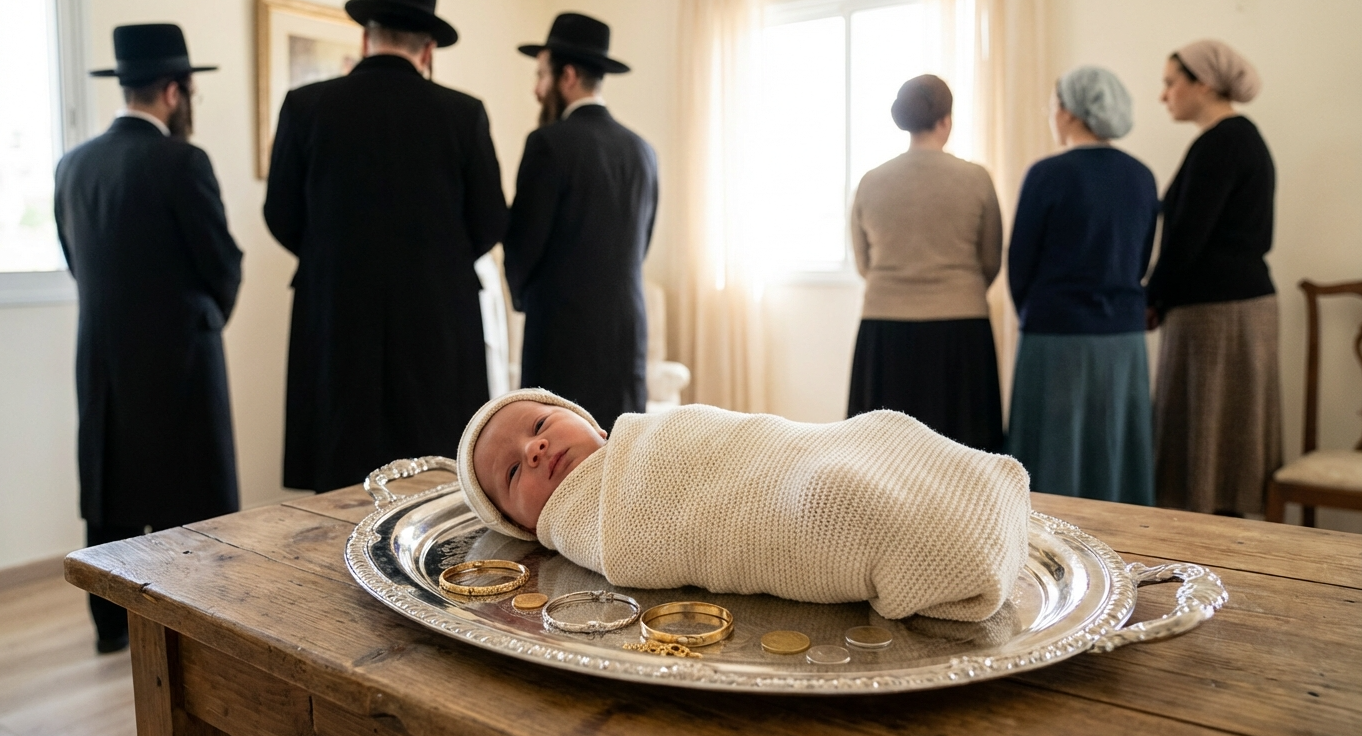В ашкеназских общинах Европы ребёнка выкладывали на серебряный поднос и обкладывали украшениями, чесноком и сахаром — как символами красоты, защиты и сладкой жизни.