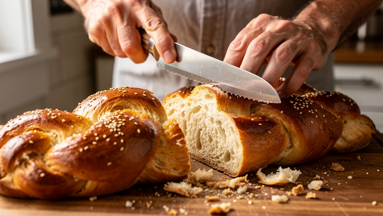 Глава семьи (или другой участник трапезы) делает легкую отметку ножом на хале, где будет делать разрез;
