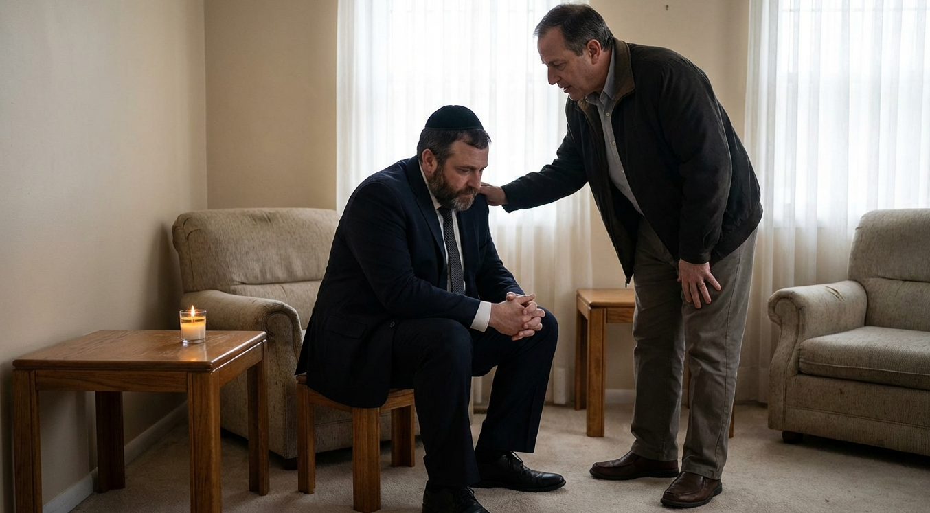 Кто-либо из присутствующих в доме, не являющихся участниками траура вместе со скорбящим, должен произнести слова утешения, а затем сказать: «Встань из своего траура!».